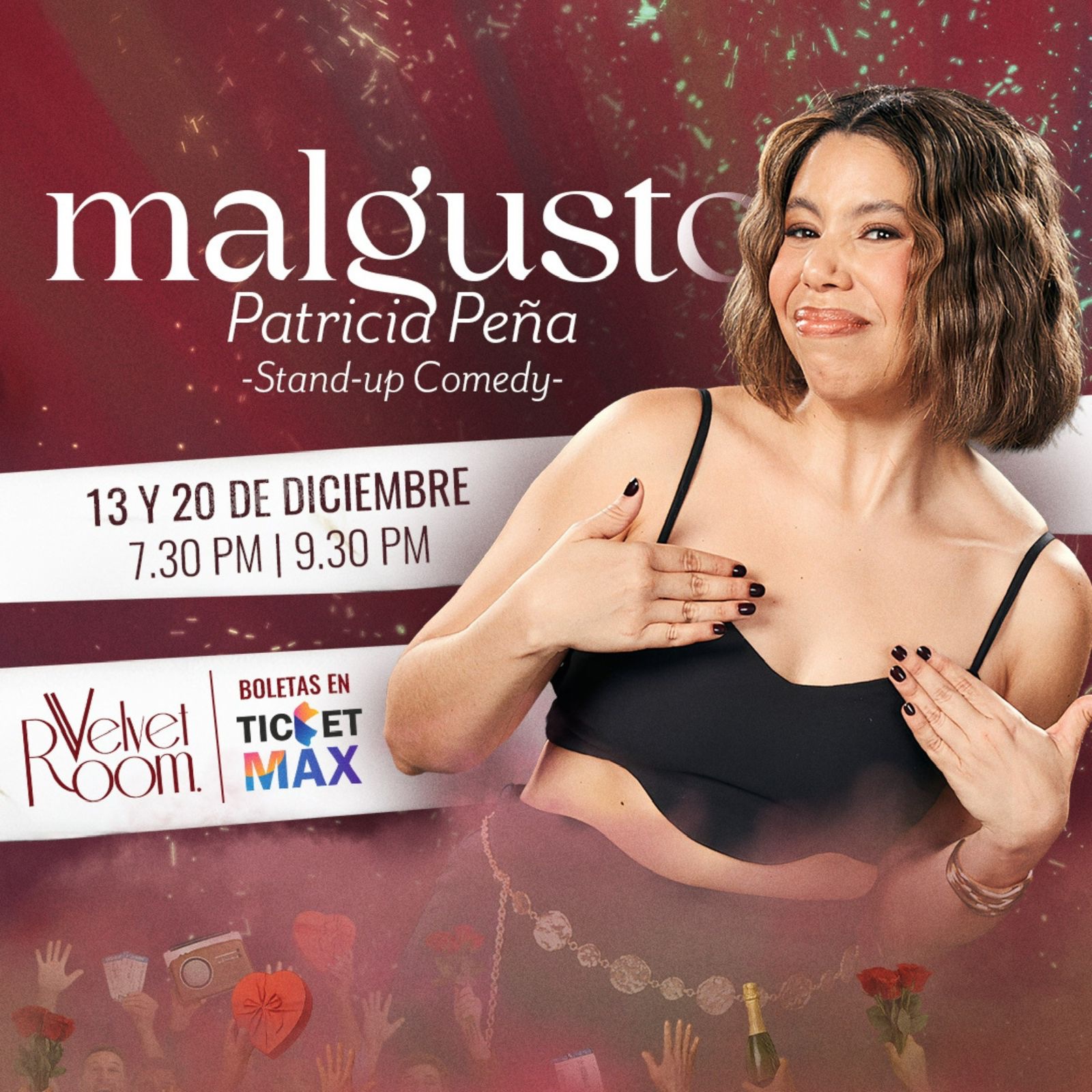 Patricia Peña regresa con MALGUSTO, el show de stand-up que ha conquistado al público por su mezcla de humor fino, confesiones atrevidas y una honestidad tan cruda que provoca carcajadas. En esta nueva función en Velvet Room, Patricia explora los malos gustos que todos hemos tenido, las decisiones impulsivas que juramos no repetir y esas historias que solo se cuentan cuando uno se siente en confianza… o frente a una audiencia lista para reírse de todo.